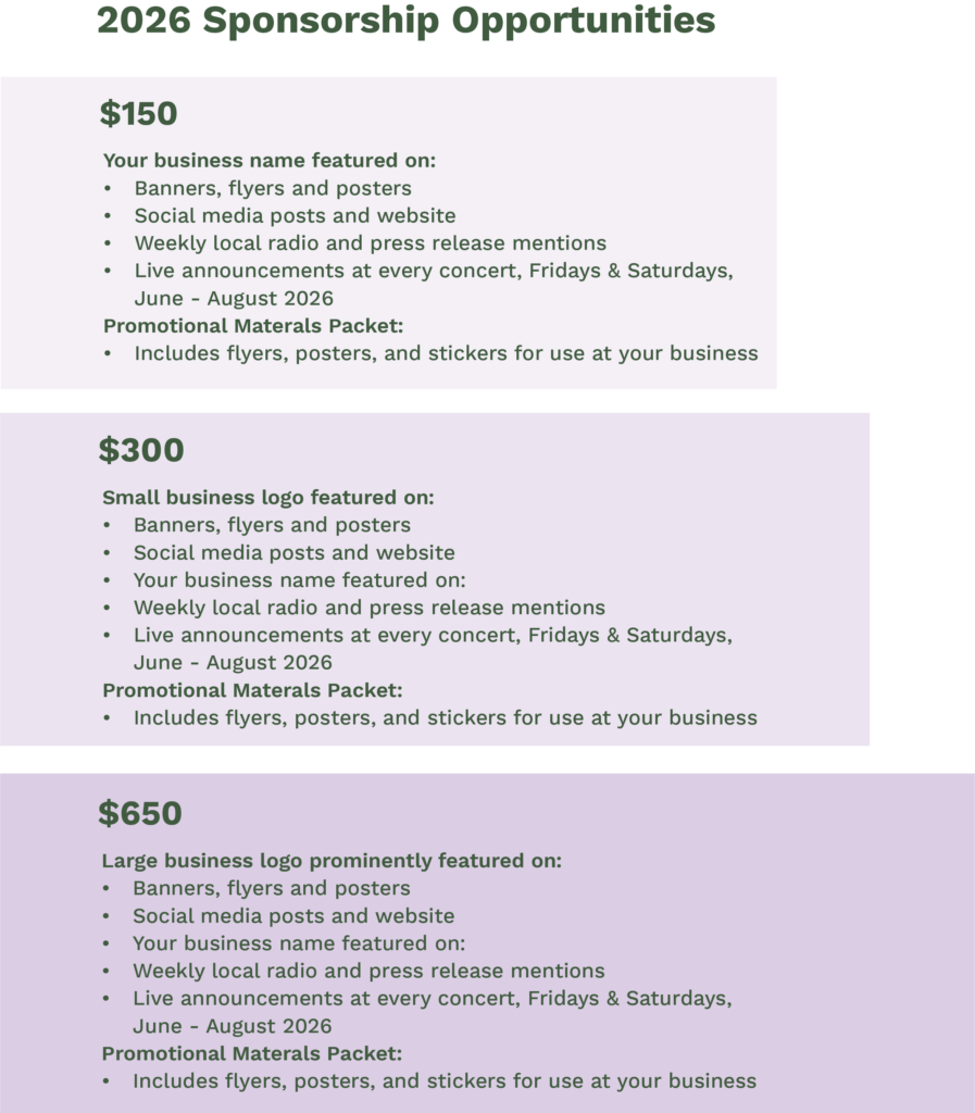 Sponsors are the sole funders behind this favorite local concert series coming into it’s 35th season in 2026!