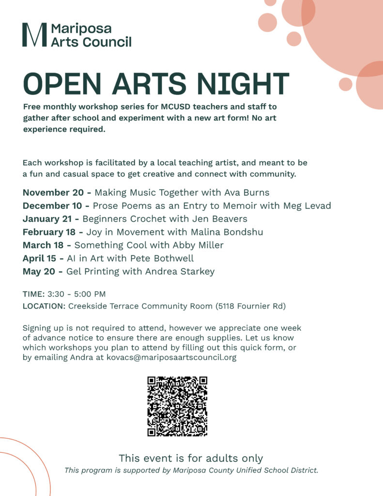 Signing up is not required to attend, however we appreciate one week of advance notice to ensure there are enough supplies. Let us know which workshops you plan to attend by filling out the sign-up form, or by emailing Andra at kovacs@mariposaartscouncil.org